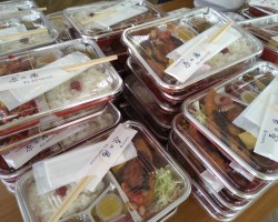 このたびのお弁当は、食中毒防止の観点から、これまでもご支援をいただいている「うるめのお宿 割烹旅館 原の湯 」さんの「ボリューム満点・こどもが好きなお弁当」を、25世帯の皆様ほか、当日お手伝いいただいたボランティアの皆さんに、計100食をお渡しすることができました。