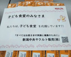今回のお弁当も、大勢のみなさんから、ご寄付を戴きました。ニラは石黒さん、じゃがいも、玉葱は内山さん、そして大根は張戸さんから戴きました。ほか、㈱北電子様からは、精米を、新潟中央ヤクルト販売㈱様からは、オレンジジュ-スパックを、フ-ドバンクみつけ様からは、お菓子や牛乳パックを、大黒製パン様からは、おいしい食材支援を戴きました。