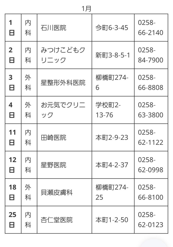2026.01.02 休日のお医者さん mitsuke-fureai 休日・夜間のお医者さん Twitter Facebook はてブ LINE Pocket 見附市HPより R8年1月~ シェア! Twitter Facebook はてブ LINE Pocket feedly