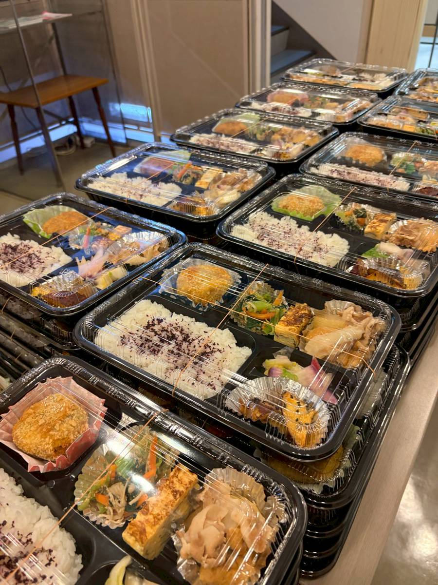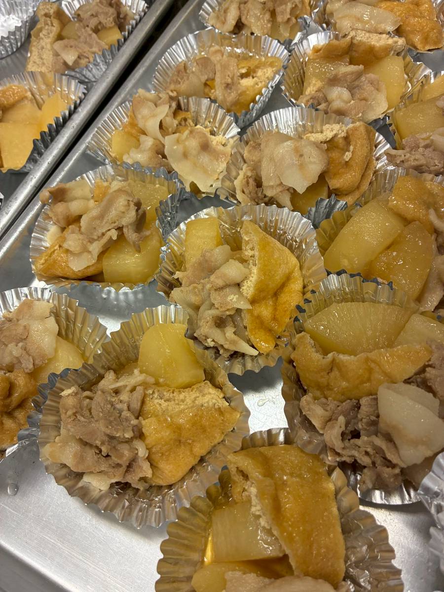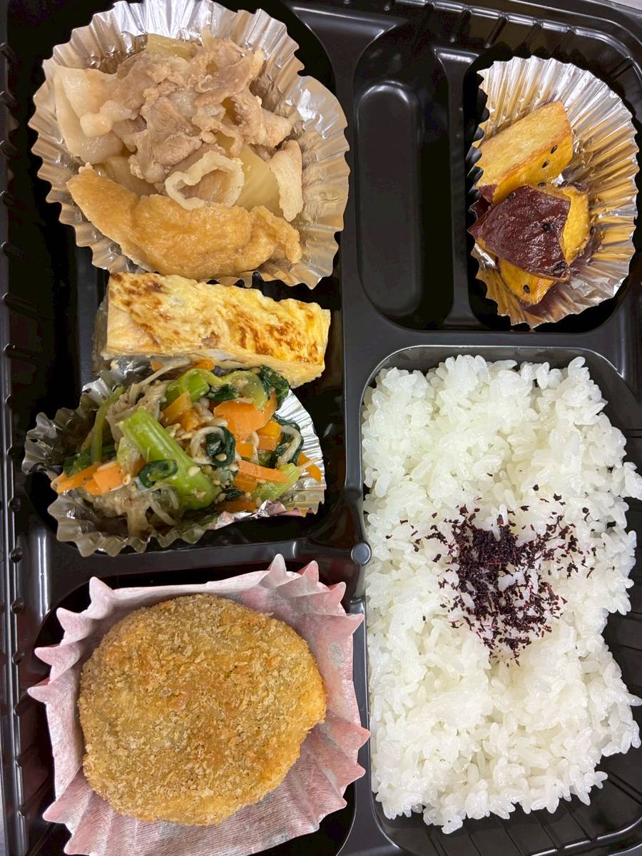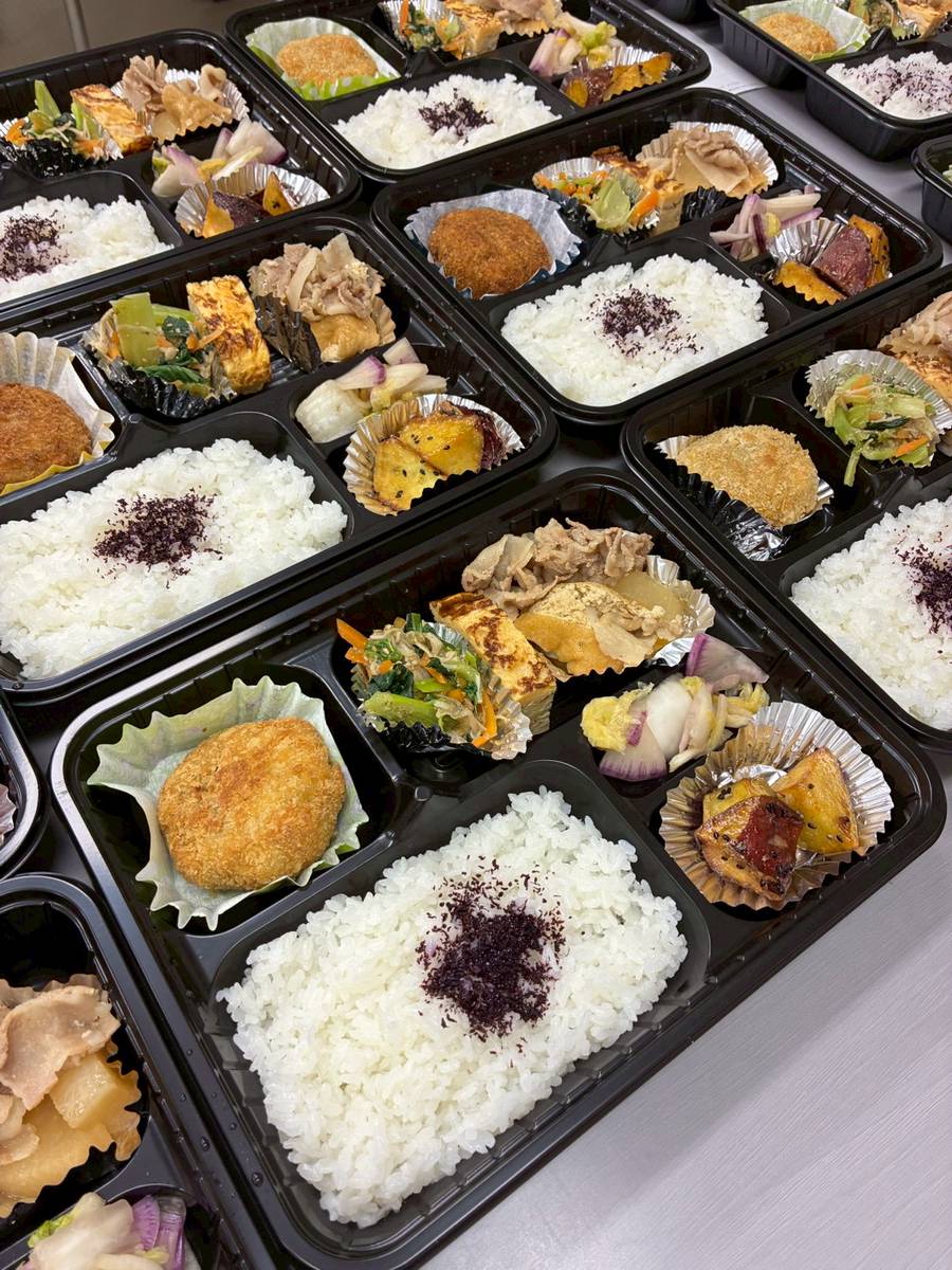 11月のお弁当は、見附産新米ご飯をはじめ、手作りコロッケに大学芋、豚バラ肉と大根のこっくり煮にお漬物、デザートにもち米とうるち米でつくったおはぎなど、24世帯60食をお渡しすることができました。