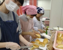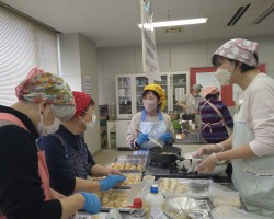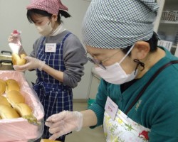 ボランティアさん達は、先月初めにリンゴジャム等、具材の試作を行ったうえで、当日14時30分にふぁみりあに集合。各々の役割を分担して、16時30分には盛り付けも終わり準備完了。たくさんの笑顔をお待ちします。