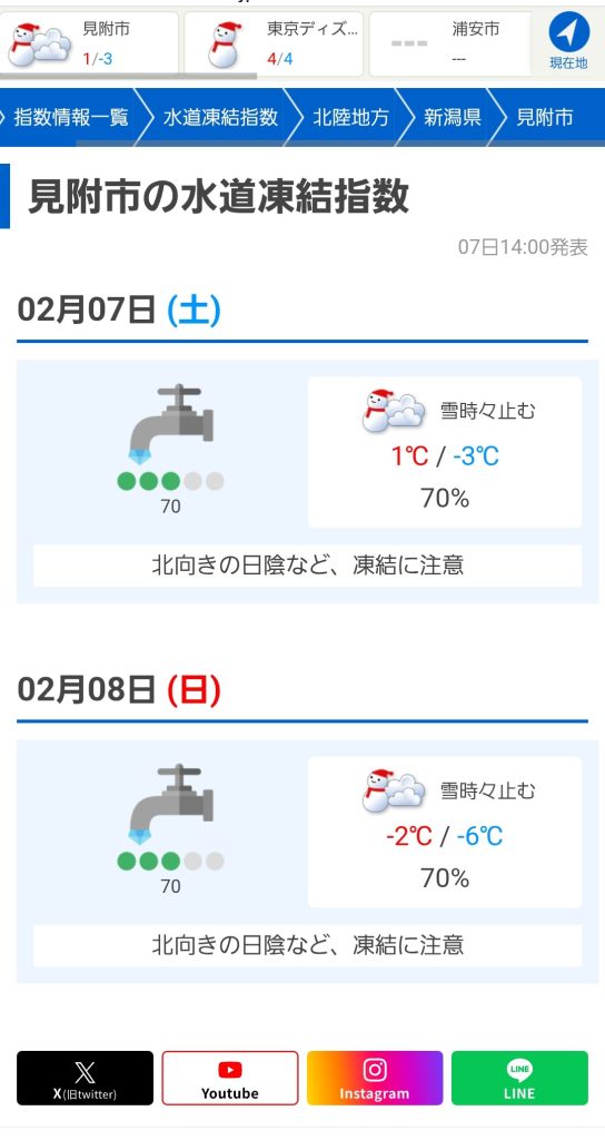 2026.02.07 ご存じですか mitsuke-fureai 8(日)の朝は水道管の凍結に注意が必要です Twitter Facebook はてブ LINE Pocket シェア! Twitter Facebook はてブ LINE Pocket feedly