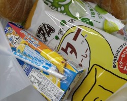 ・鶏の唐揚げ・野菜のオーブン焼き・洋風ちらし寿司・アスパラ菜の胡麻和え・玉子焼き・ウィンナー・漬物・さつま芋のサラダ・揚げパン・ロールケーキ・お菓子の詰め合わせ