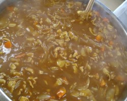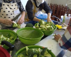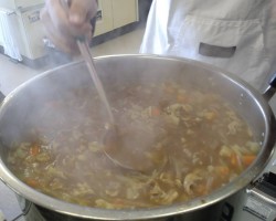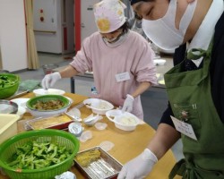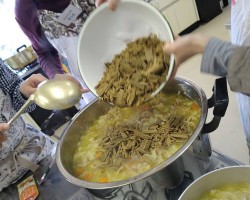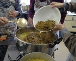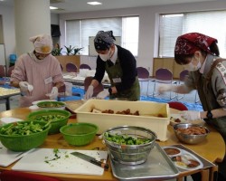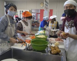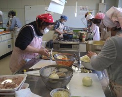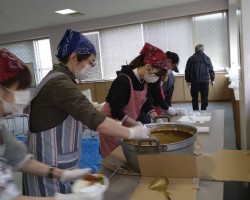 これに続き、あらかじめ編成した「カレー班」「炊飯・副菜班」「パン担当班」「盛付班」「会場・受付班」のボランティアのみなさん32人が結集してのお弁当づくりスタートです。先月のお弁当配食の経験をもとに、各々が工夫を凝らして今月はよりスムーズに出来たと思いますよ!(^o^)
